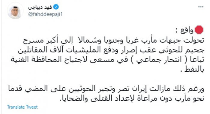 وكتب في تغريدة عبر "تويتر" رصدها "المشهد العربي": "تحولت جبهات مأرب غربا وجنوبا وشمالا إلى أكبر مسرح جحيم للحوثي عقب إصرار ودفع المليشيات آلاف المقاتلين تباعا (انتحار جماعي) في مسعى لاجتياح المحافظة الغنية بالنفط".