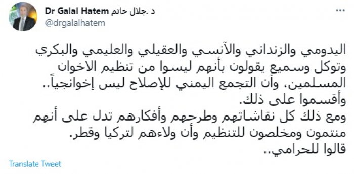 حاتم: أفكار قيادات الإصلاح تدحض أكاذيبهم وتؤكد انتماءهم لتنظيم الإخوان