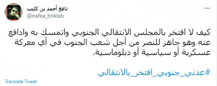 وأضاف: "عدني جنوبي افتخر بالانتقالي".