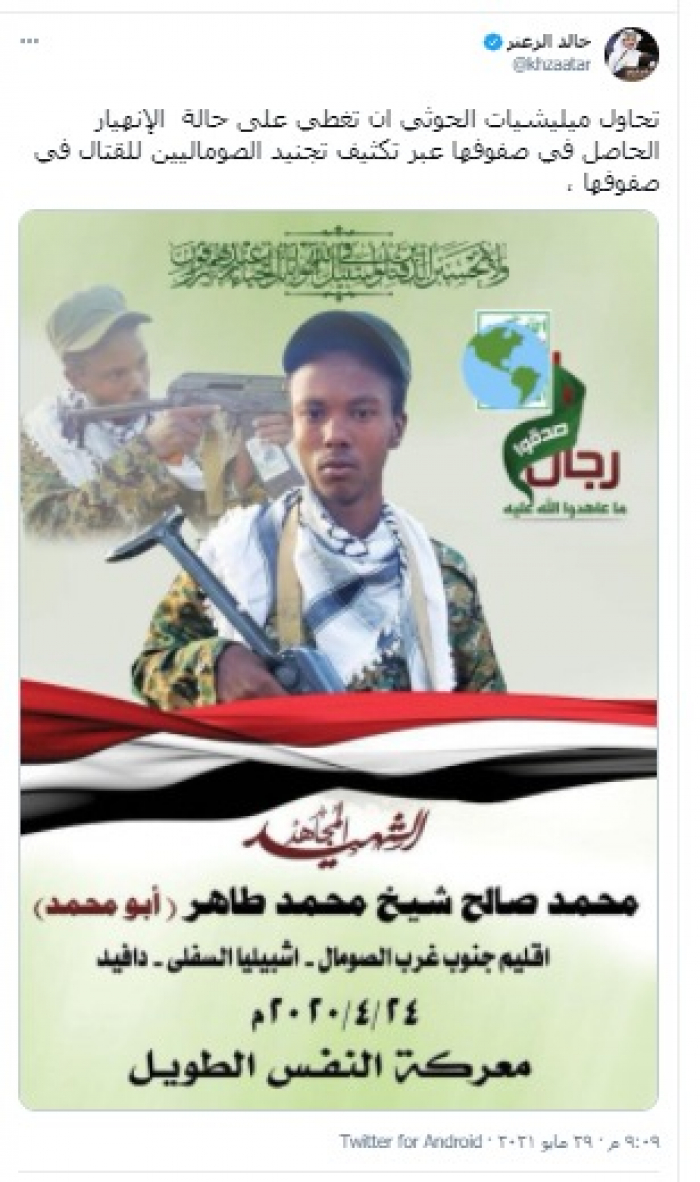 وكتب "الزعتر" عبر تغريدة بتويتر، رصدها "المشهد العربي": "تحاول مليشيات الحوثي أن تغطي على حالة الانهيار الحاصل في صفوفها عبر تكثيف تجنيد الصوماليين للقتال في صفوفها".