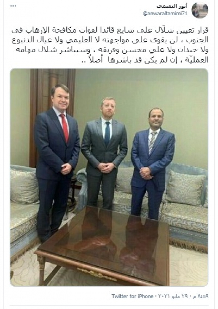 وكتب "التميمي" عبر تغريدة له بتويتر، رصدها "المشهد العربي": "قرار تعيين شلّال علي شائع قائدا لقوات مكافحة الإرهاب في الجنوب، لن يقوى على مواجهته لا العليمي ولا عيال الدنبوع ولا حيدان ولا علي محسن وفريقه".