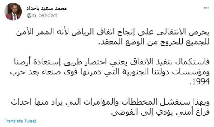 وقال في تغريدة عبر "تويتر" رصدها "المشهد العربي": "يحرص الانتقالي على إنجاح اتفاق الرياض لأنه الممر الآمن للجميع للخروج من الوضع المعقد".