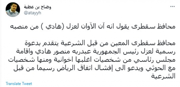وقال في تغريدة عبر "تويتر" رصدها "المشهد العربي": "محافظ سقطرى يقول أنه آن الآوان لعزل (هادي) من منصبه".