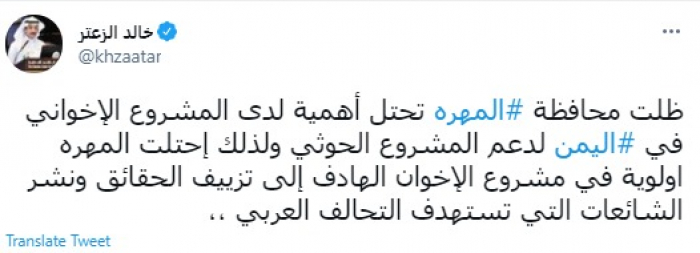 الزعتر: المهرة لها أهمية لدى إخوان اليمن.. وهذا سبب حملاتهم على التحالف