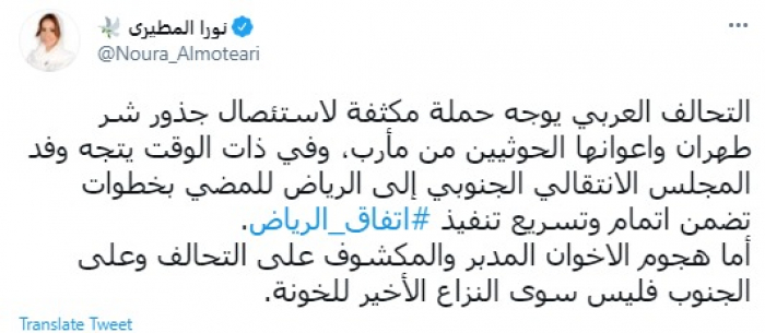 وقالت في تغريدة عبر "تويتر" رصدها "المشهد العربي": "التحالف العربي يوجه حملة مكثفة لاستئصال جذور شر طهران وأعوانها الحوثيين من مأرب، وفي ذات الوقت يتجه وفد المجلس الانتقالي الجنوبي إلى الرياض للمضي بخطوات تضمن إتمام وتسريع تنفيذ اتفاق الرياض".
