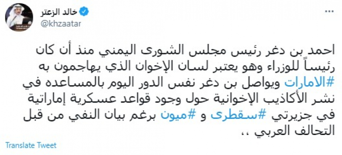 وقال في تغريدة عبر "تويتر" رصدها "المشهد العربي": "أحمد بن دغر رئيس مجلس الشورى اليمني منذ أن كان رئيسًا للوزراء وهو يعتبر لسان الإخوان الذي يهاجمون به الإمارات".