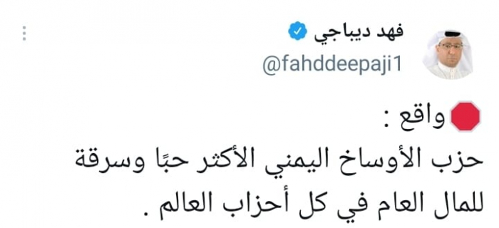 حمل المحلل السياسي السعودي فهد ديباجي، حزب الإصلاح الإخواني المسؤولية عن سرقة المال العام، أكثر من أحزاب العالم مجتمعة.