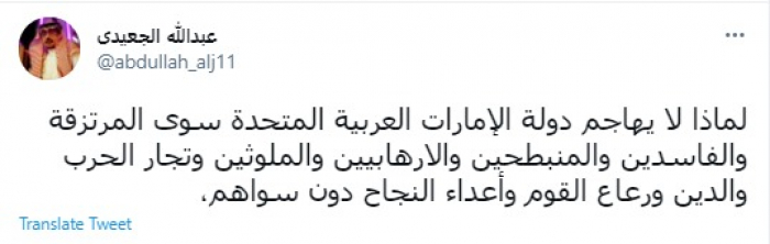 وقال في تغريدة عبر "تويتر" رصدها "المشهد العربي": "لماذا لا يهاجم دولة الإمارات العربية المتحدة سوى المرتزقة والفاسدين والمنبطحين والإرهابيين والملوثين وتجار الحرب والدين ورعاع القوم وأعداء النجاح دون سواهم".