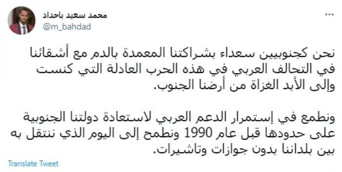 وأضاف: "ونطمع في استمرار الدعم العربي لاستعادة دولتنا الجنوبية على حدودها قبل عام 1990 ونطمح إلى اليوم الذي ننتقل به بين بلداننا بدون جوازات وتأشيرات".