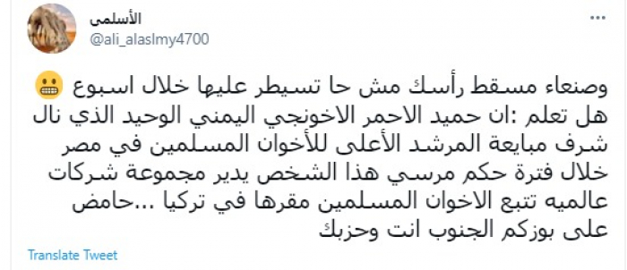 وأضاف: "هل تعلم أن حميد الأحمر الإخونجي اليمني الوحيد الذي نال شرف مبايعة المرشد الأعلى للإخوان المسلمين في مصر خلال فترة حكم مرسي".