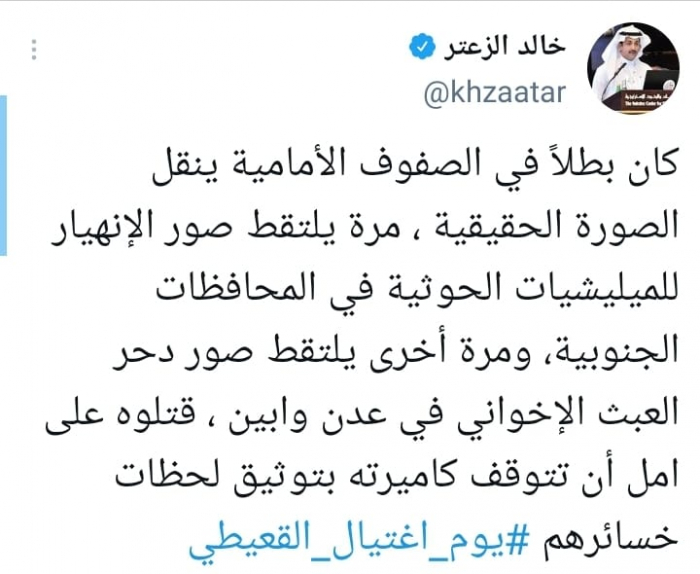 وأكد أنهم: "قتلوه على أمل أن تتوقف كاميرته بتوثيق لحظات خسائرهم"، مختتما بهاشتاج: "يوم اغتيال القعيطي".