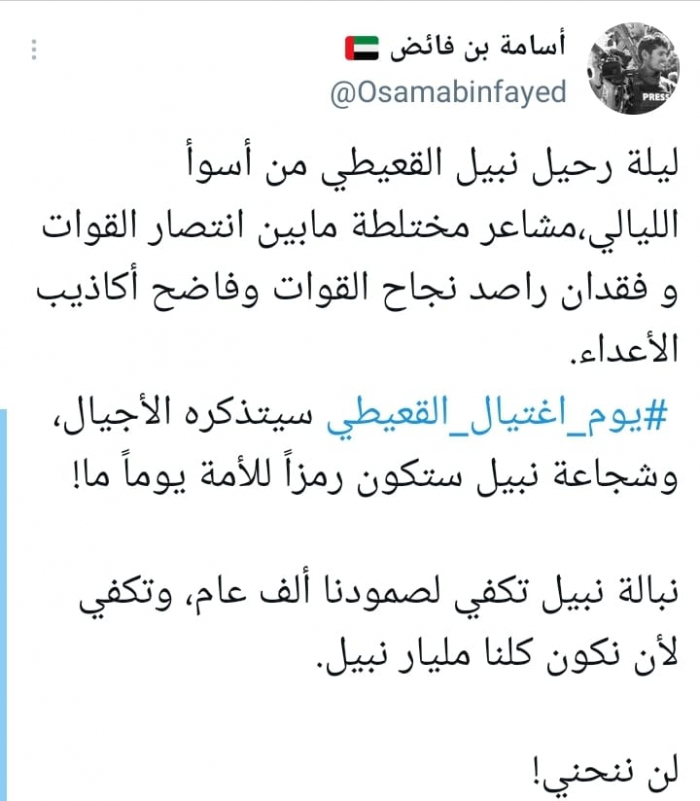 وأوضح أن: "يوم اغتيال القعيطي ستتذكره الأجيال، وشجاعة نبيل ستكون رمزا للأمة يوما ما!".