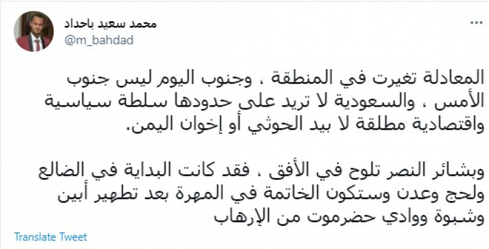 باحداد: المعادلة تغيرت في المنطقة.. وبشائر النصر الجنوبي تلوح بالأفق