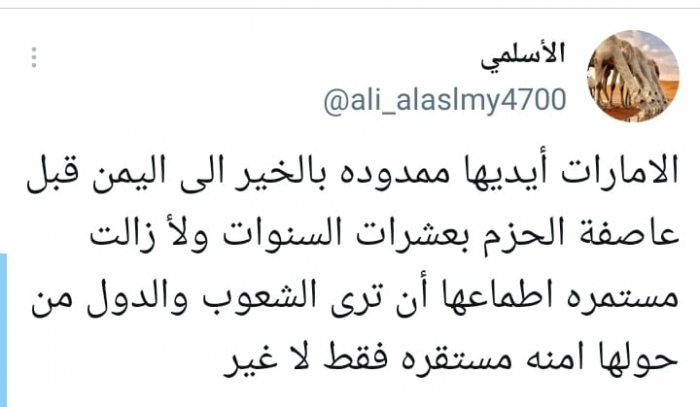 أكد الناشط السياسي علي الأسلمي، أن الدور الإماراتي الإنساني يسبق قيام عاصفة الحزم بسنوات طويلة، لتحقيق الاستقرار والأمن.