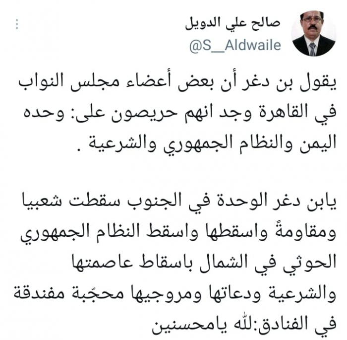 وأشار في تغريدة على حسابه بموقع التدوين المصغر تويتر، اليوم إلى أنه: "يقول بن دغر أن بعض أعضاء مجلس النواب في القاهرة وجد أنهم حريصون على: وحدة اليمن والنظام الجمهوري والشرعية".