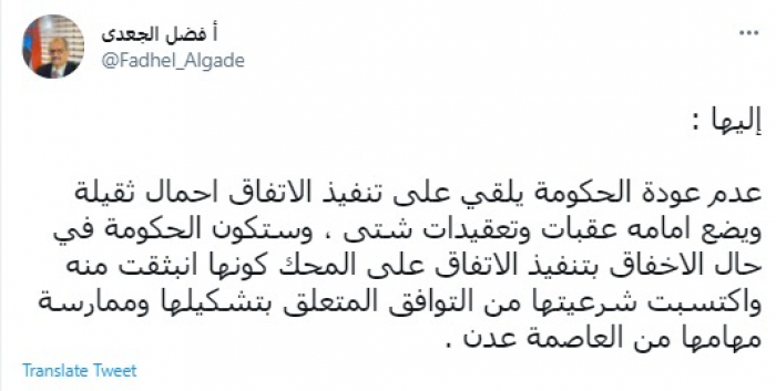 وقال في تغريدة عبر "تويتر" رصدها "المشهد العربي": "عدم عودة الحكومة يلقي على تنفيذ الاتفاق أحمال ثقيلة ويضع أمامه عقبات وتعقيدات شتى".