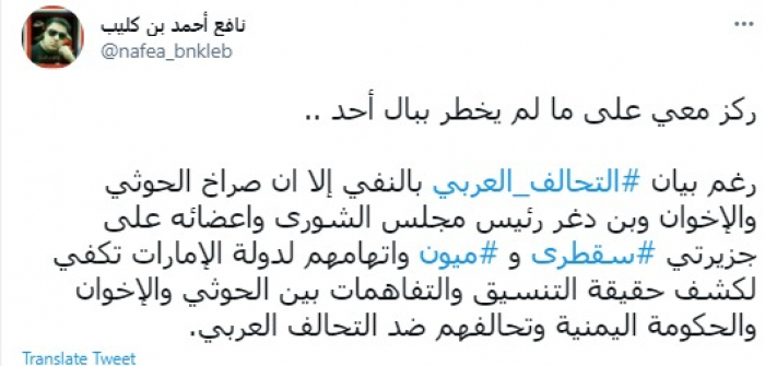 وأضاف: "رغم بيان التحالف العربي بالنفي إلا أن صراخ الحوثي والإخوان وبن دغر رئيس مجلس الشورى وأعضائه على جزيرتي سقطرى وميون واتهامهم لدولة الإمارات".