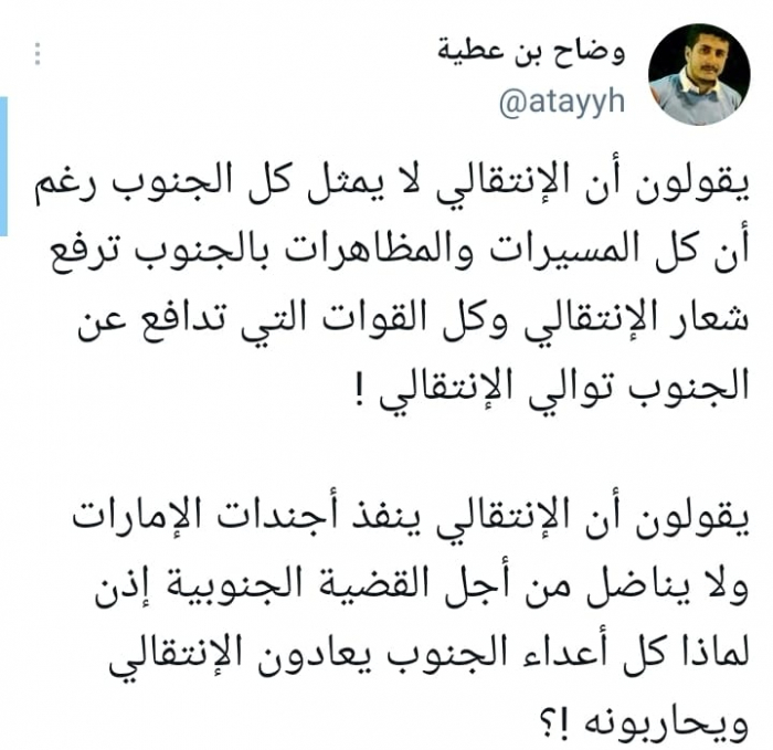 وأوضح في تغريدة على حسابه بموقع التدوين المصغر تويتر، اليوم أنهم: "يقولون أن الانتقالي لا يمثل كل الجنوب رغم أن كل المسيرات والمظاهرات بالجنوب ترفع شعار الانتقالي وكل القوات التي تدافع عن الجنوب توالي الانتقالي!".