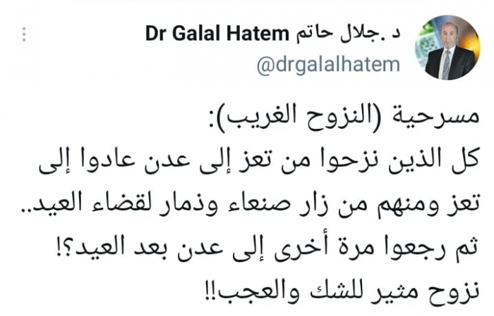 وأشار في تغريدة على حسابه بموقع التدوين المصغر تويتر، اليوم إلى: "مسرحية (النزوح الغريب): كل الذين نزحوا من تعز إلى عدن عادوا إلى تعز ومنهم من زار صنعاء وذمار لقضاء العيد".