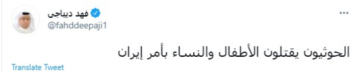 وكتب في تغريدة عبر "تويتر" رصدها "المشهد العربي": "الحوثيون يقتلون الأطفال والنساء بأمر إيران".