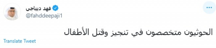 وأضاف في تغريدة أخرى: "الحوثيون متخصصون في تنجيز وقتل الأطفال".