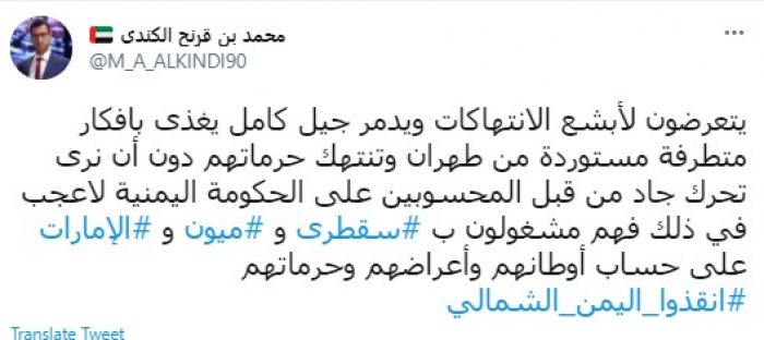 وكتب في تغريدة عبر "تويتر" رصدها "المشهد العربي": "يتعرضون لأبشع الانتهاكات ويدمر جيل كامل يغذى بأفكار متطرفة مستوردة من طهران وتنتهك حرماتهم".