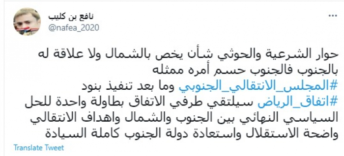 وكتب في تغريدة عبر "تويتر" رصدها "المشهد العربي": "حوار الشرعية والحوثي شأن يخص بالشمال ولا علاقة له بالجنوب".