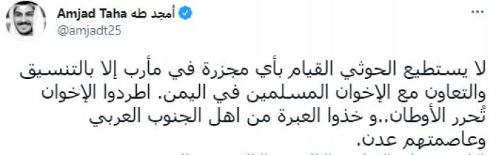 وقال في تغريدة عبر "تويتر" رصدها "المشهد العربي": "لا يستطيع الحوثي القيام بأي مجزرة في مأرب إلا بالتنسيق والتعاون مع الإخوان المسلمين في اليمن".
