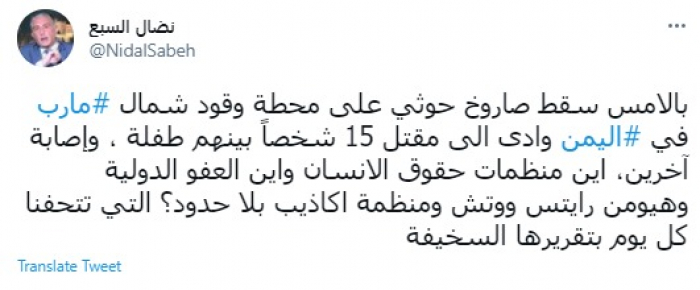 السبع يتساءل: أين منظمات حقوق الإنسان من مجزرة الحوثي الأخيرة بمأرب؟