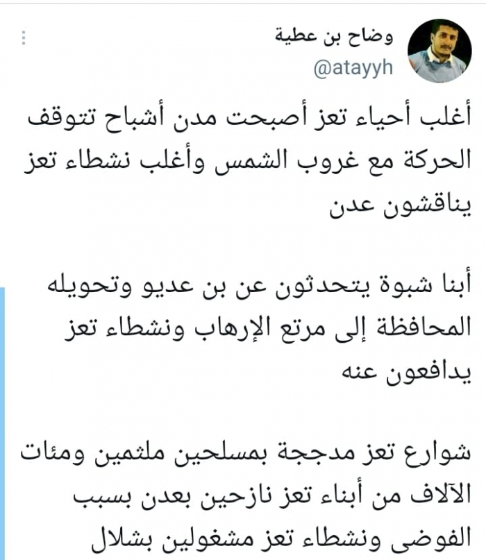 وأضاف أن: "أغلب نشطاء تعز يناقشون عدن، أبناء شبوة يتحدثون عن بن عديو وتحويله المحافظة إلى مرتع الإرهاب ونشطاء تعز يدافعون عنه".