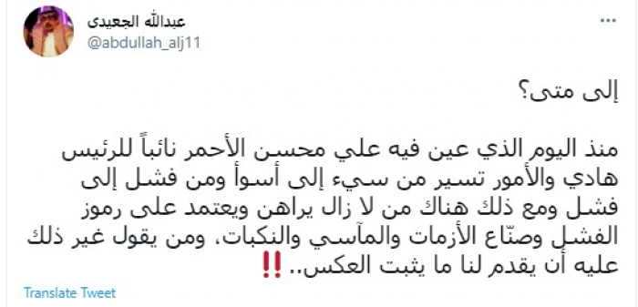 وقال في تغريدة عبر "تويتر" رصدها "المشهد العربي": "إلى متى؟.. منذ اليوم الذي عين فيه علي محسن الأحمر نائبًا للرئيس هادي والأمور تسير من سيء إلى أسوأ ومن فشل إلى فشل".