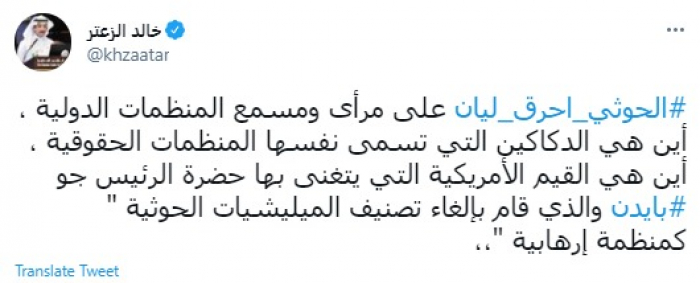 استنكر المحلل السياسي السعودي خالد الزعتر، اليوم، صمت المنظمات الإنسانية الدولية والإدارة الأمريكية بشأن جريمة مليشيات الحوثي الإرهابية الأخيرة بحق الطفلة ليان.