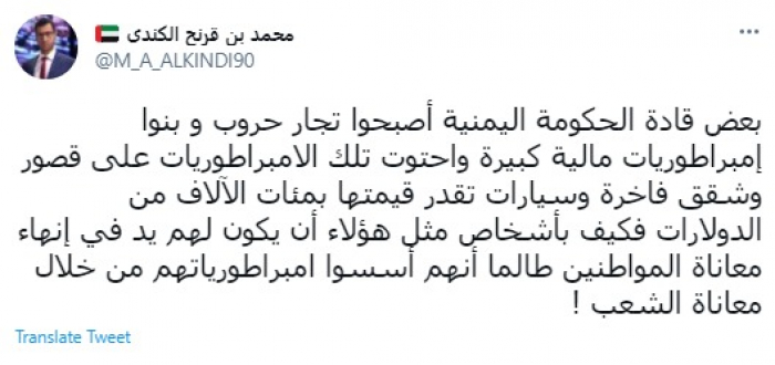 وقال في تغريدة عبر "تويتر" رصدها "المشهد العربي": "بعض قادة الحكومة اليمنية أصبحوا تجار حروب وبنوا إمبراطوريات مالية كبيرة".