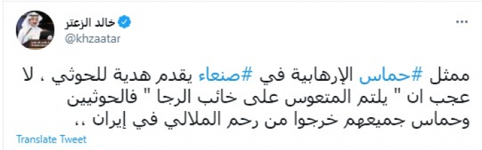 انتقد المحلل السياسي السعودي خالد الزعتر، اليوم، حركة حماس الفلسطينية جراء تقديم ممثلها في صنعاء المدعو معاذ أبو شمالة هدايا للقيادي بمليشيات الحوثي الإرهابية المدعو محمد علي الحوثي.