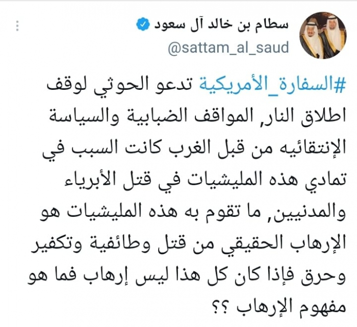 تعجب الأمير السعودي سطام بن خالد آل سعود من مهادنة المجتمع الدولي لمليشيا الحوثي الإرهابية، مؤكدا أن المواقف الضبابية مسؤولة عن تماديها في جرائم قتل الأبرياء.