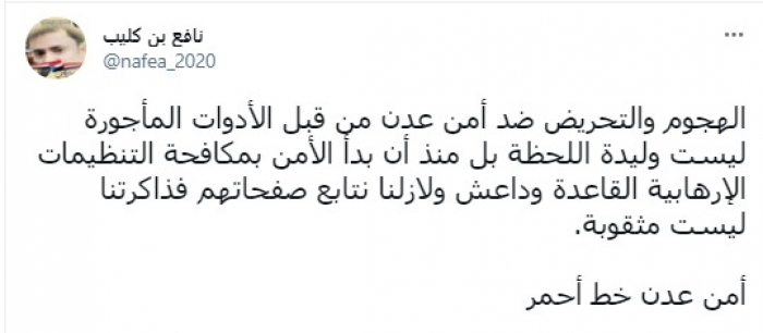 وكتب في تغريدة عبر "تويتر" رصدها "المشهد العربي": "الهجوم والتحريض ضد أمن عدن من قبل الأدوات المأجورة ليست وليدة اللحظة بل منذ أن بدأ الأمن بمكافحة التنظيمات الإرهابية القاعدة وداعش ولا زلنا نتابع صفحاتهم فذاكرتنا ليست مثقوبة".