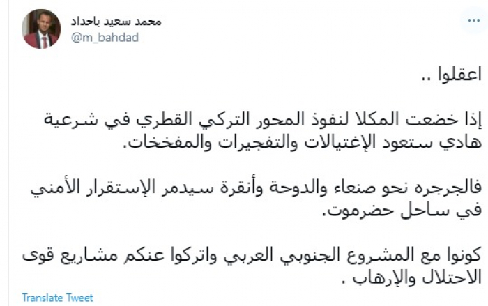 وقال في تغريدة عبر "تويتر" رصدها "المشهد العربي": "اعقلوا.. إذا خضعت المكلا لنفوذ المحور التركي القطري في شرعية هادي ستعود الاغتيالات والتفجيرات والمفخخات".