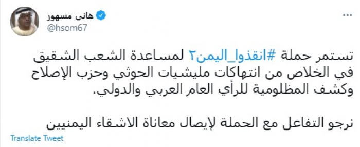 وقال في تغريدة عبر "تويتر" رصدها "المشهد العربي": "تستمر حملة انقذوا اليمن 2 لمساعدة الشعب الشقيق في الخلاص من انتهاكات مليشيات الحوثي وحزب الإصلاح وكشف المظلومية للرأي العام العربي والدولي".