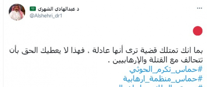 الشهري عن تكريم حماس للحوثي: تحالفوا مع القتلة والإرهابيين