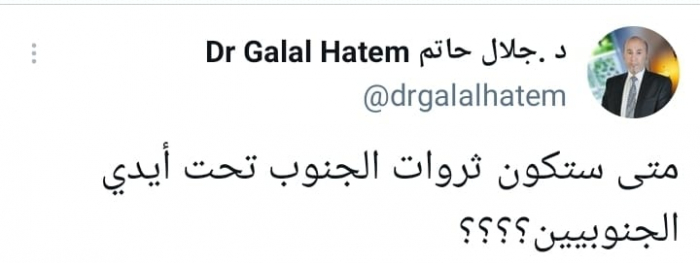 وتساءل في تغريدة على حسابه بموقع التدوين المصغر تويتر، اليوم: "متى ستكون ثروات الجنوب تحت أيدي الجنوبيين؟؟؟؟".