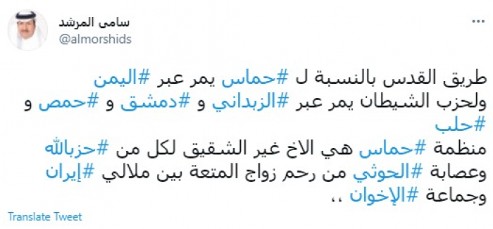 وقال في تغريدة عبر "تويتر" رصدها "المشهد العربي": "طريق القدس بالنسبة لحماس يمر عبر اليمن ولحزب الشيطان يمر عبر الزبداني ودمشق وحمص وحلب".