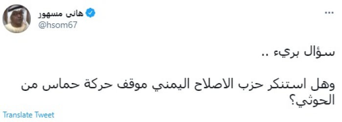 وقال في تغريدة عبر "تويتر" رصدها "المشهد العربي": "سؤال بريء.. وهل استنكر حزب الإصلاح اليمني موقف حركة حماس من الحوثي؟".