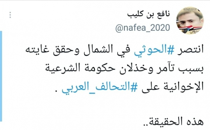 اعتبر الناشط السياسي نافع بن كليب، أن انتصار مليشيا الحوثي الإرهابية في الشمال، نتيجة تخاذل الشرعية الإخوانية عن مساندة التحالف العربي، ومؤامراتها.