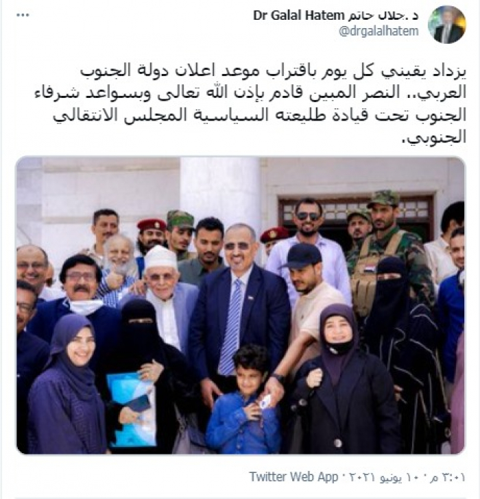 وكتب "حاتم" عبر تغريدة له بحسابه بمنصة تويتر، رصدها "المشهد العربي": "يزداد يقيني كل يوم باقتراب موعد إعلان دولة الجنوب العربي".