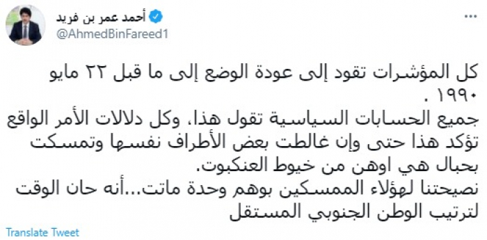 وكتب في تغريدة عبر "تويتر" رصدها "المشهد العربي": "كل المؤشرات تقود إلى عودة الوضع إلى ما قبل 22 مايو 1990".