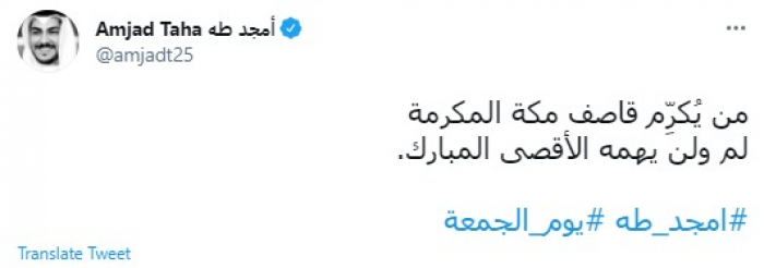 وقال في تغريدة عبر "تويتر" رصدها "المشهد العربي": "من يُكرِّم قاصف مكة المكرمة لم ولن يهمه الأقصى المبارك".