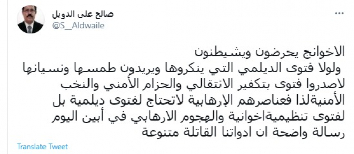 وأضاف: "لذا فعناصرهم الإرهابية لاتحتاج لفتوى ديلمية بل لفتوى تنظيمية إخوانية".