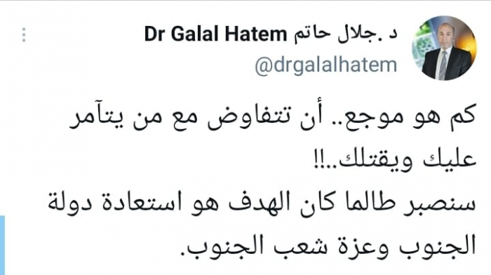 وأكد في تغريدة على حسابه بموقع التدوين المصغر تويتر، اليوم أن: "كم هو موجع.. أن تتفاوض مع من يتآمر عليك ويقتلك!!"، متابعا: "سنصبر طالما كان الهدف هو استعادة دولة الجنوب وعزة شعب الجنوب".