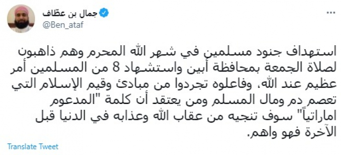 وقال في تغريدة عبر "تويتر" رصدها "المشهد العربي": "استهداف جنود مسلمين في شهر الله المحرم وهم ذاهبون لصلاة الجمعة بمحافظة أبين واستشهاد 8 من المسلمين أمر عظيم عند الله".