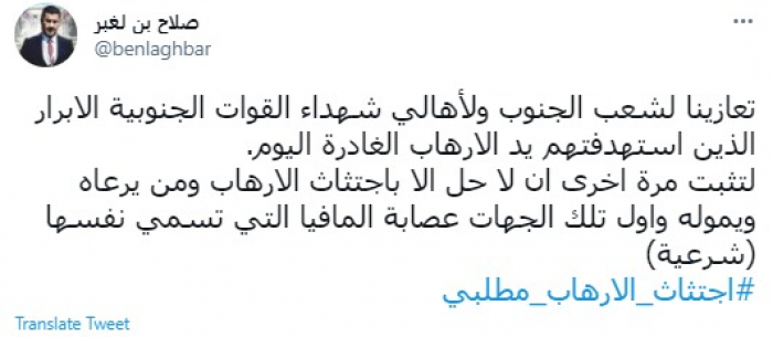 وقال في تغريدة عبر "تويتر" رصدها "المشهد العربي": "تعازينا لشعب الجنوب ولأهالي شهداء القوات الجنوبية الأبرار الذين استهدفتهم يد الإرهاب الغادرة".